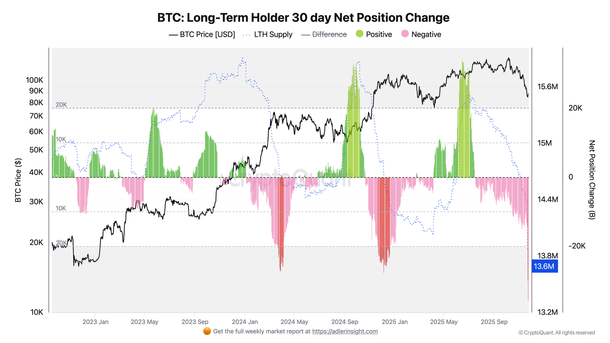 The 30-day Net Position Change of Long-Term Holders has gone deeply negative, comparable only to March 2024 (sell-off after $73K ATH) and October 2024 (ATH→$85K). The current phase shows aggressive coin dumping, with red bars reaching peak depth while price simultaneously declined from the October peak.