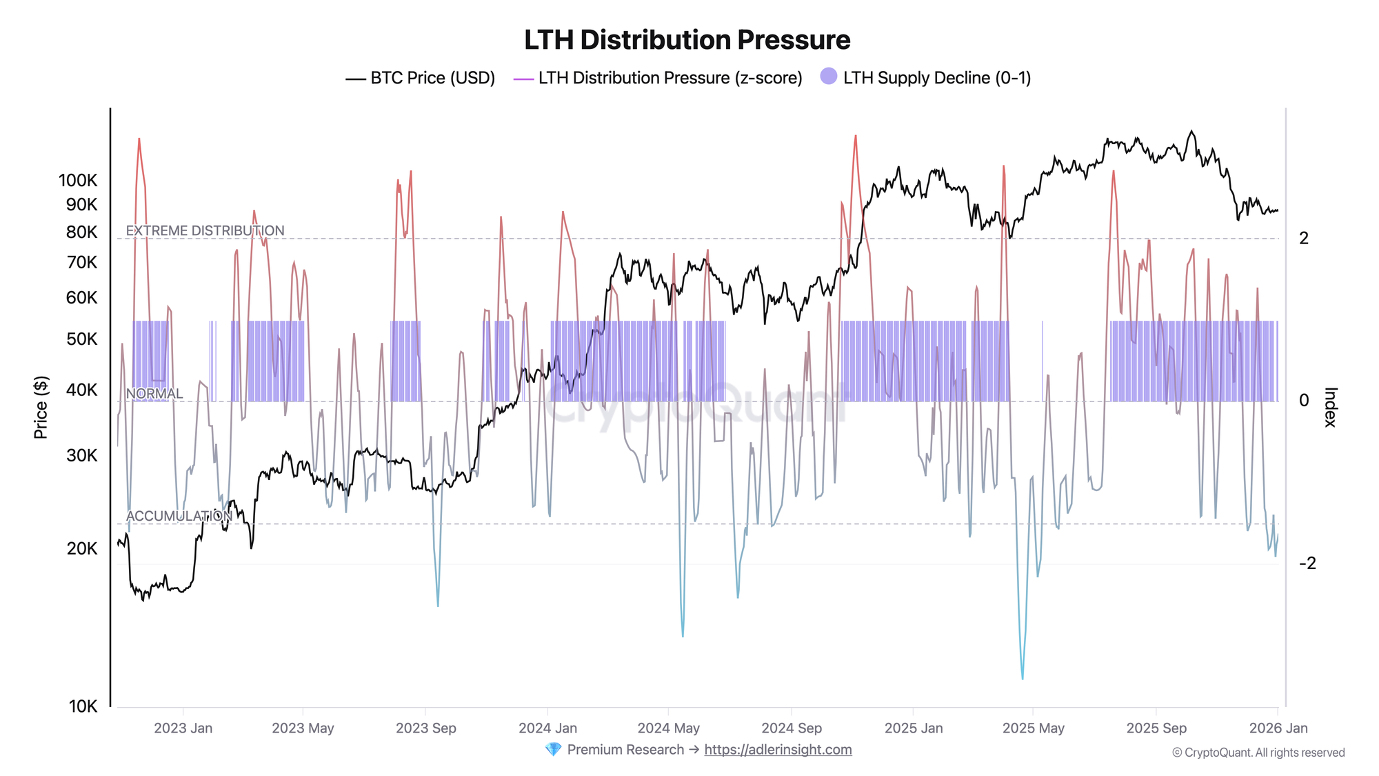 LTH Distribution Pressure Index has dropped into the ACCUMULATION zone, signaling minimal selling pressure from long-term holders. At the current price of around $87K, LTH activity remains subdued, which is historically characteristic of consolidation phases.