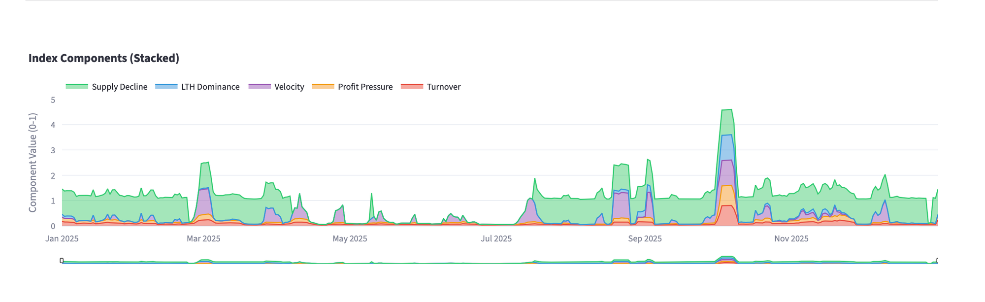 The index aggregates five components: LTH supply turnover, SOPR, spending change velocity, LTH/STH dominance, and supply dynamics. The Z-score normalizes the composite indicator relative to a 90-day window.