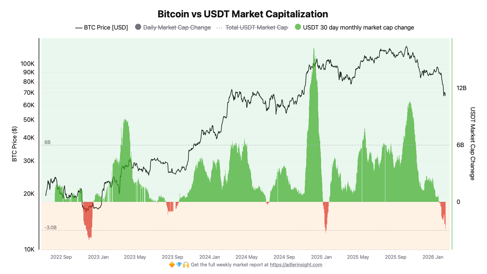 Two liquidity indicators confirm market weakness. SSR Oscillator has returned to negative territory after a brief move into positive in January - BTC continues to underperform relative to stablecoin dynamics. Meanwhile, the 30-day change in USDT market cap has dropped to -$2.87B, signaling liquidity outflows from the ecosystem.