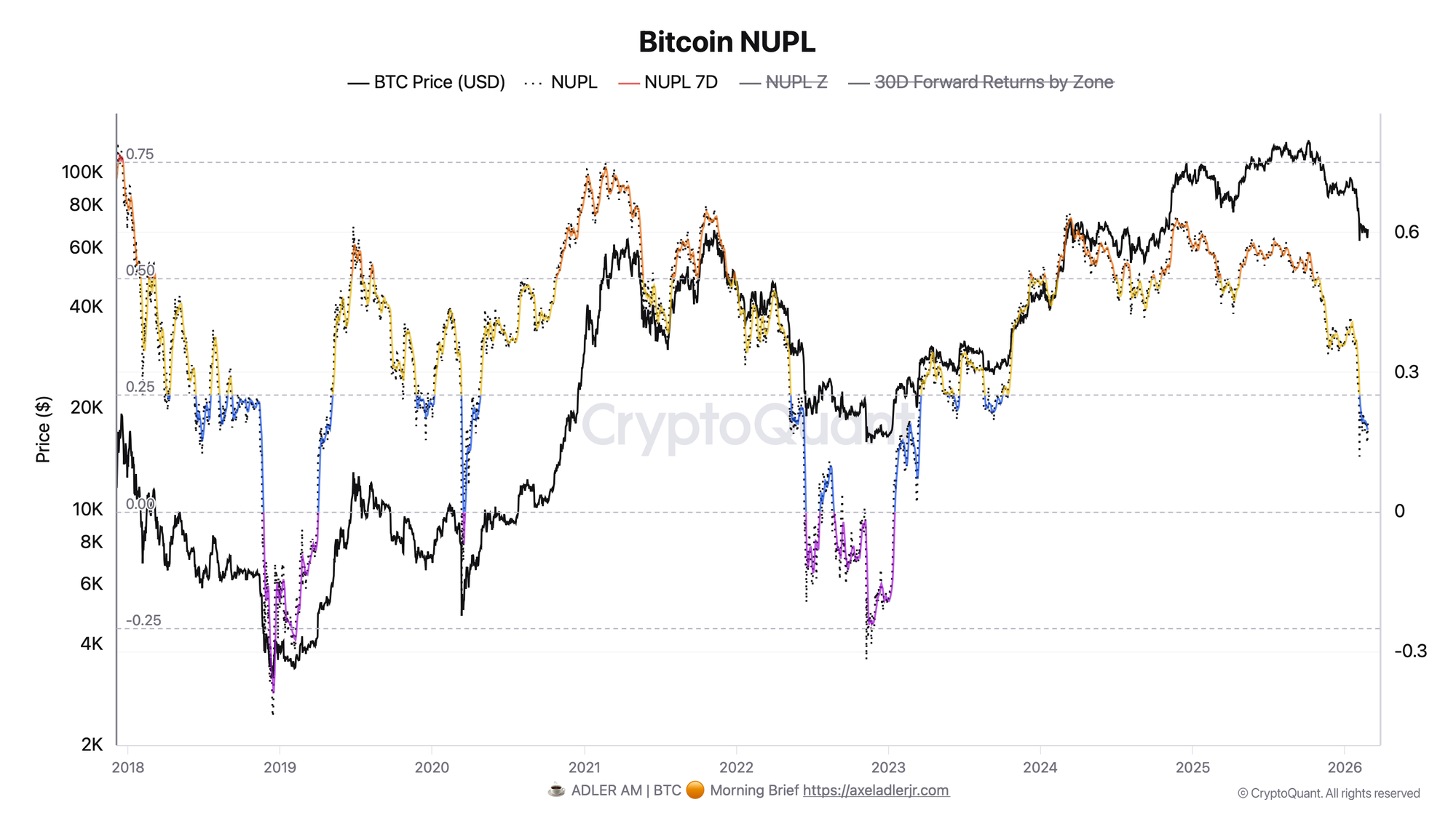 Connecting the dots: the divergence between the two metrics forms the central thesis of this brief. The MVRV Z-Score is already anomalously low relative to past bear phases - mathematical pressure is present. But NUPL does not confirm capitulation - the psychological breakdown has not yet occurred.