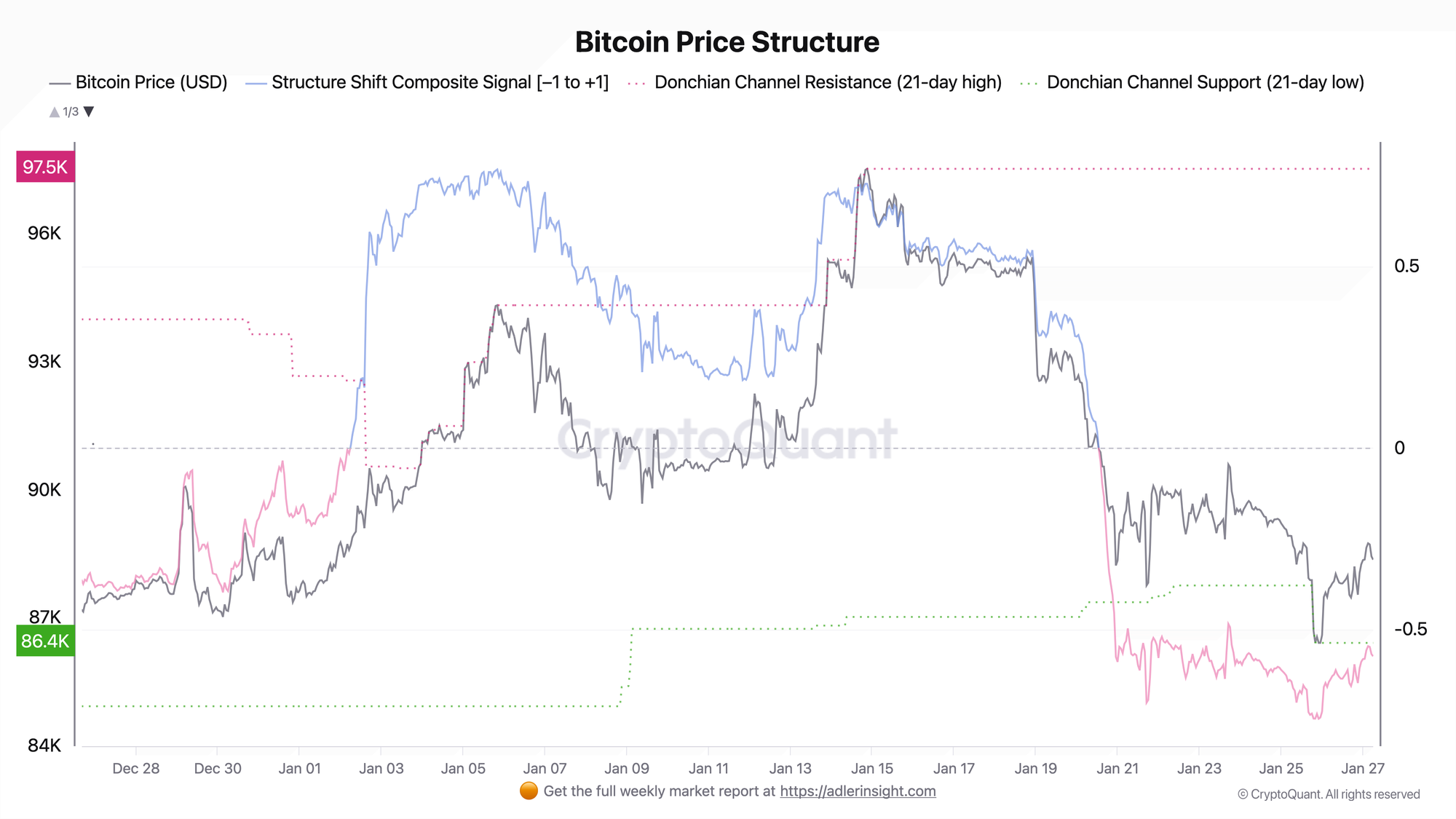Market Pressure Index hit a new 30-day low, dropping to 30.54, below the extremes of January 21 and 25. Yet price remained stable around $88.3K. Price structure confirms the critical zone: BTC trades in the lower 17% of the Donchian channel near $86.4K support.