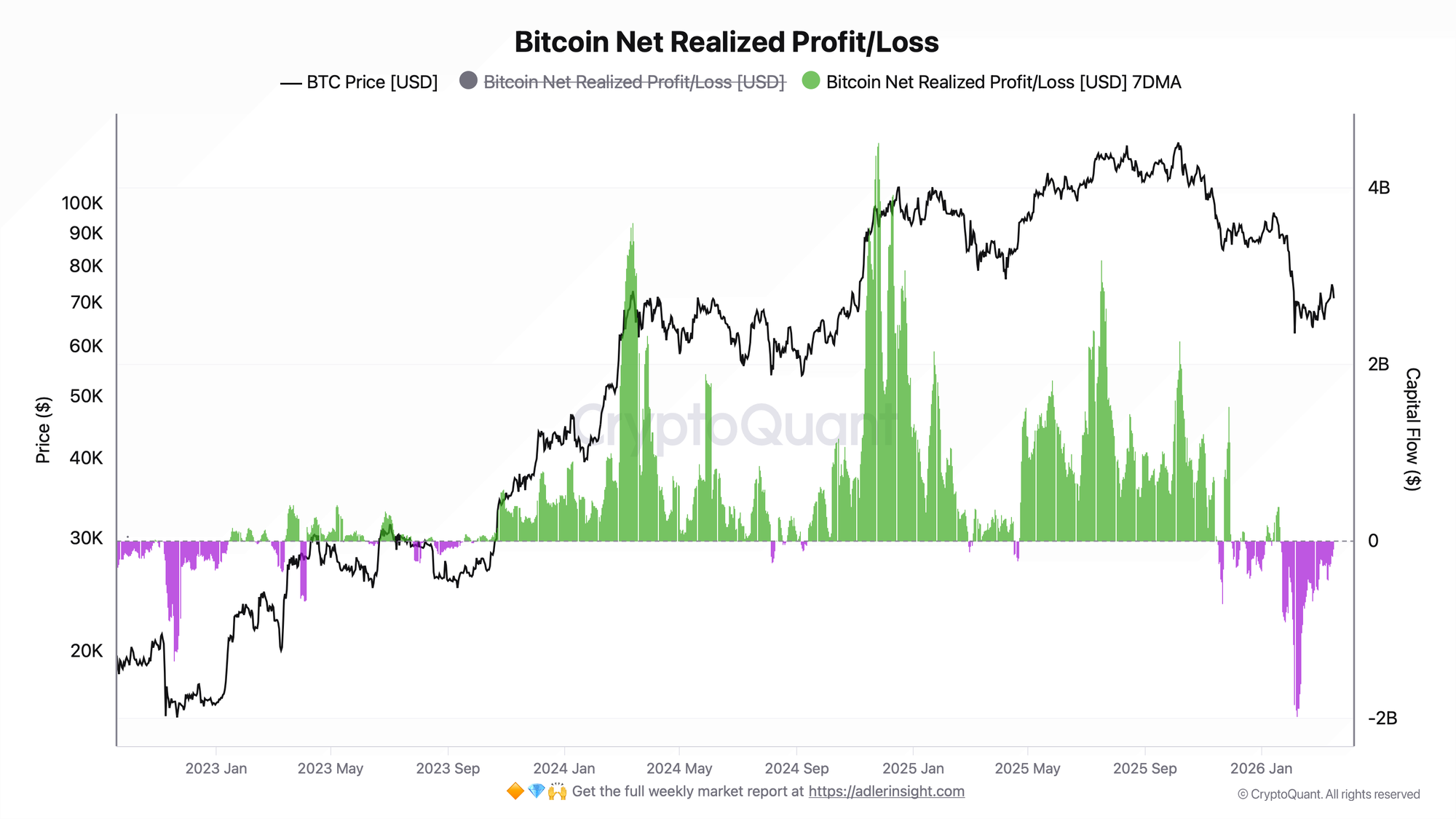 From October 2023 through end of 2024, Bitcoin Net Realized Profit/Loss held steadily in positive territory - participants were locking in profit, which accompanied the rally from $30K to the peak of $125K. Starting in late 2025 the picture changed: purple loss bars began appearing more frequently and deeper, and in January-February 2026 the metric dropped to values around -$2B - levels not seen since the 2022-2023 bear market. Currently the 7DMA remains near zero or slightly in negative territory.