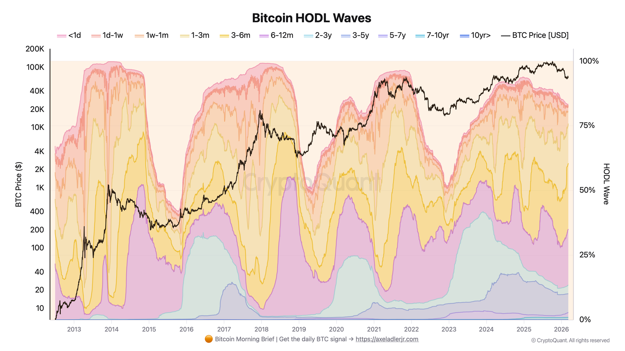 - HODL Waves show the percentage of supply held in each age band - useful for reading accumulation vs. distribution momentum by volume of coins.