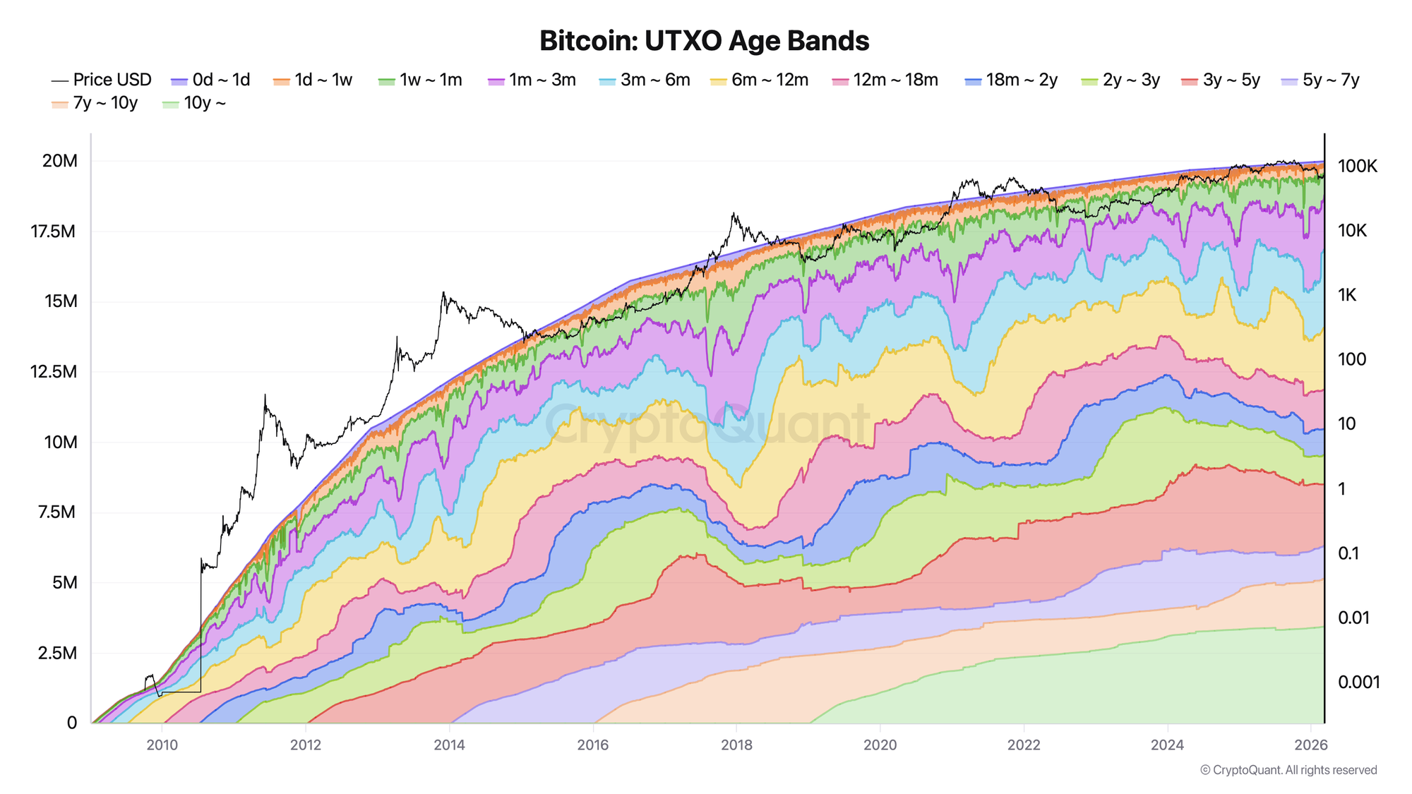 Age Band: A time window defining how long a UTXO has been dormant since its last on-chain move. Standard bands: 0d-1d, 1d-1w, 1w-1m, 1m-3m, 3m-6m, 6m-12m, 12m-18m, 18m-2y, 2y-3y, 3y-5y, 5y-7y, 7y-10y, 10y+.