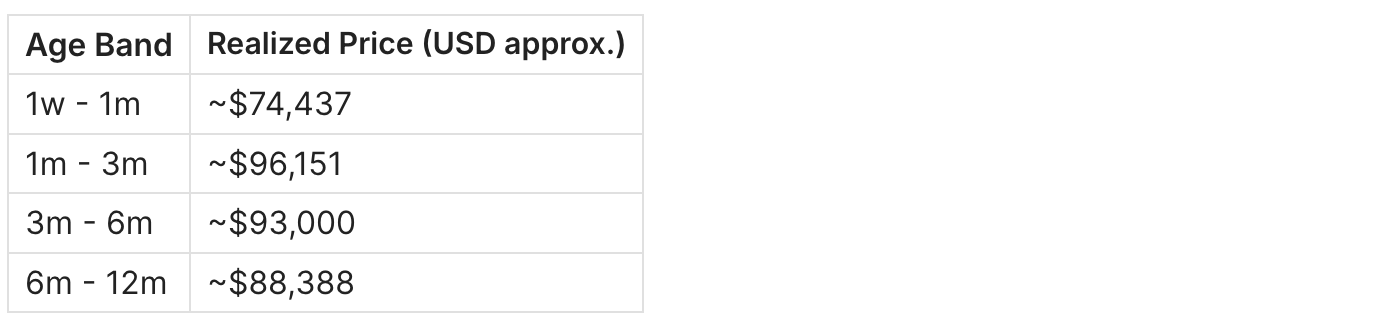 Realized Price (cohort-level): The supply-weighted average of the last transaction price for all UTXOs in a given age bracket. Unlike spot price, it does not move until coins actually move on-chain.