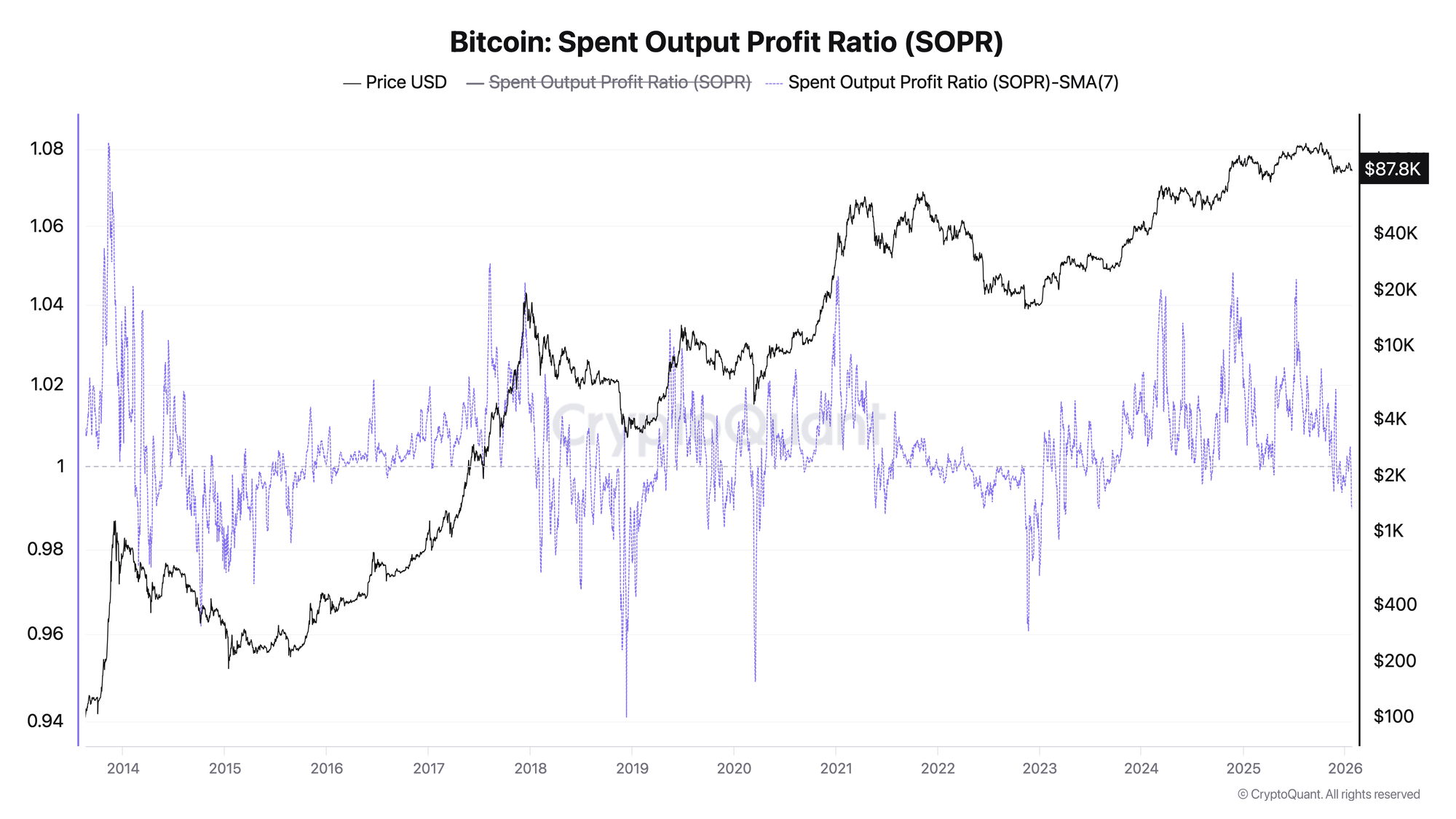 - SOPR = 1: Break-even, key support/resistance level