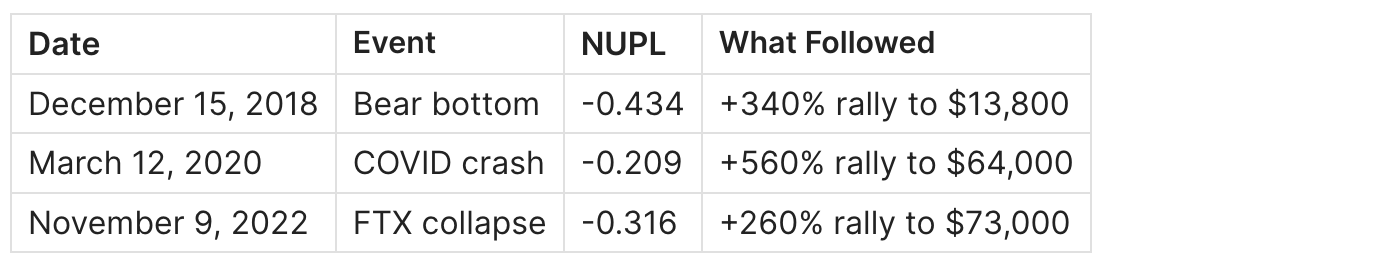 Extended negative NUPL indicates prolonged bear markets where price remains below aggregate cost basis. This occurred in 2014-2015 and 2018-2019. These periods represent accumulation phases for patient investors - historically, buying during extended negative NUPL has produced strong returns.