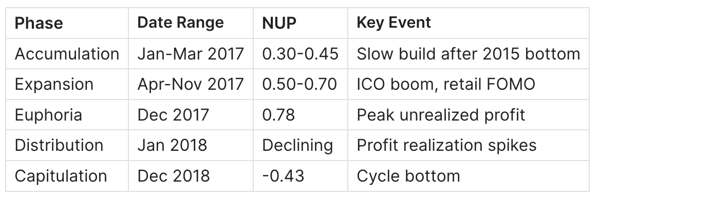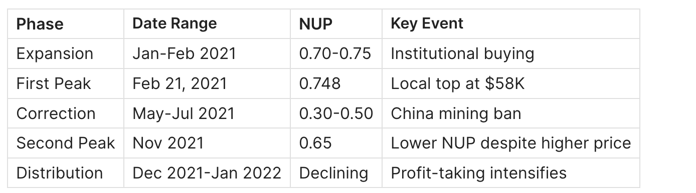 Key insight: The second ATH in November 2021 ($69K) showed lower NUP than the first peak ($58K in February). This bearish divergence - higher price, lower unrealized profit - signaled structural weakness.
