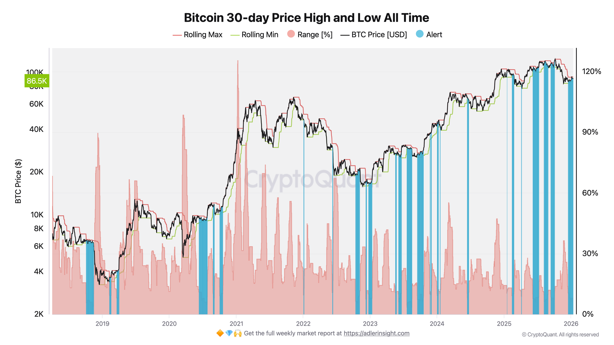 This metric is important from a market structure perspective, since price breakouts beyond the 30-day range are often accompanied by increased activity from algorithmic and trend-following strategies. Combined with volatility data, this suggests not a guaranteed breakout, but rather that the market is approaching a phase where the probability of directional movement increases.