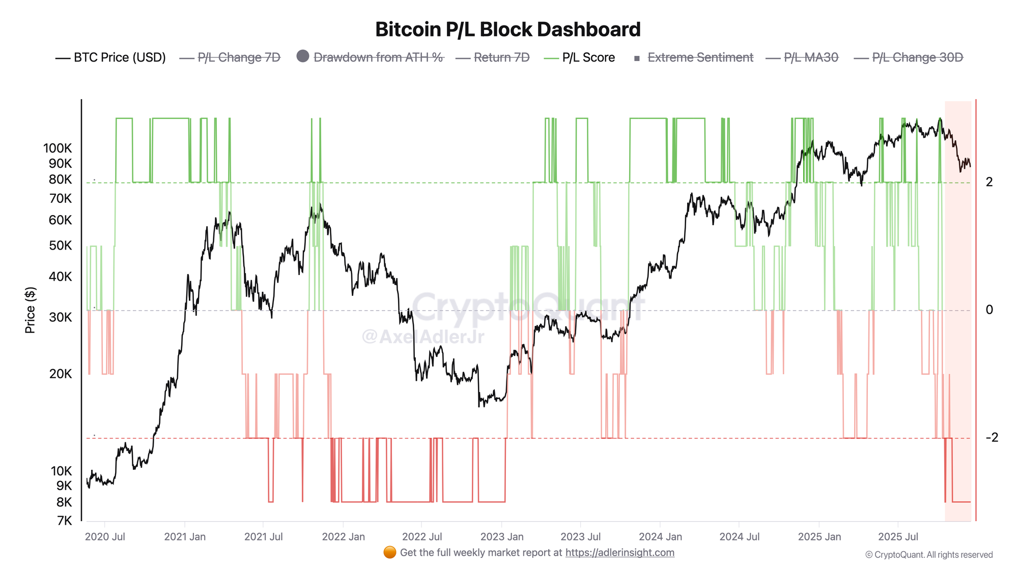 P/L Block visualizes the aggregated state of market participants' profits and losses through colored blocks: green - profit predominance, red - loss predominance. The current period is marked with a red block, corresponding to negative sentiment. The P/L Score value is at minus three, which is classified as pronounced stress. The drawdown from the all-time high is 30%, and 30-day returns are negative.