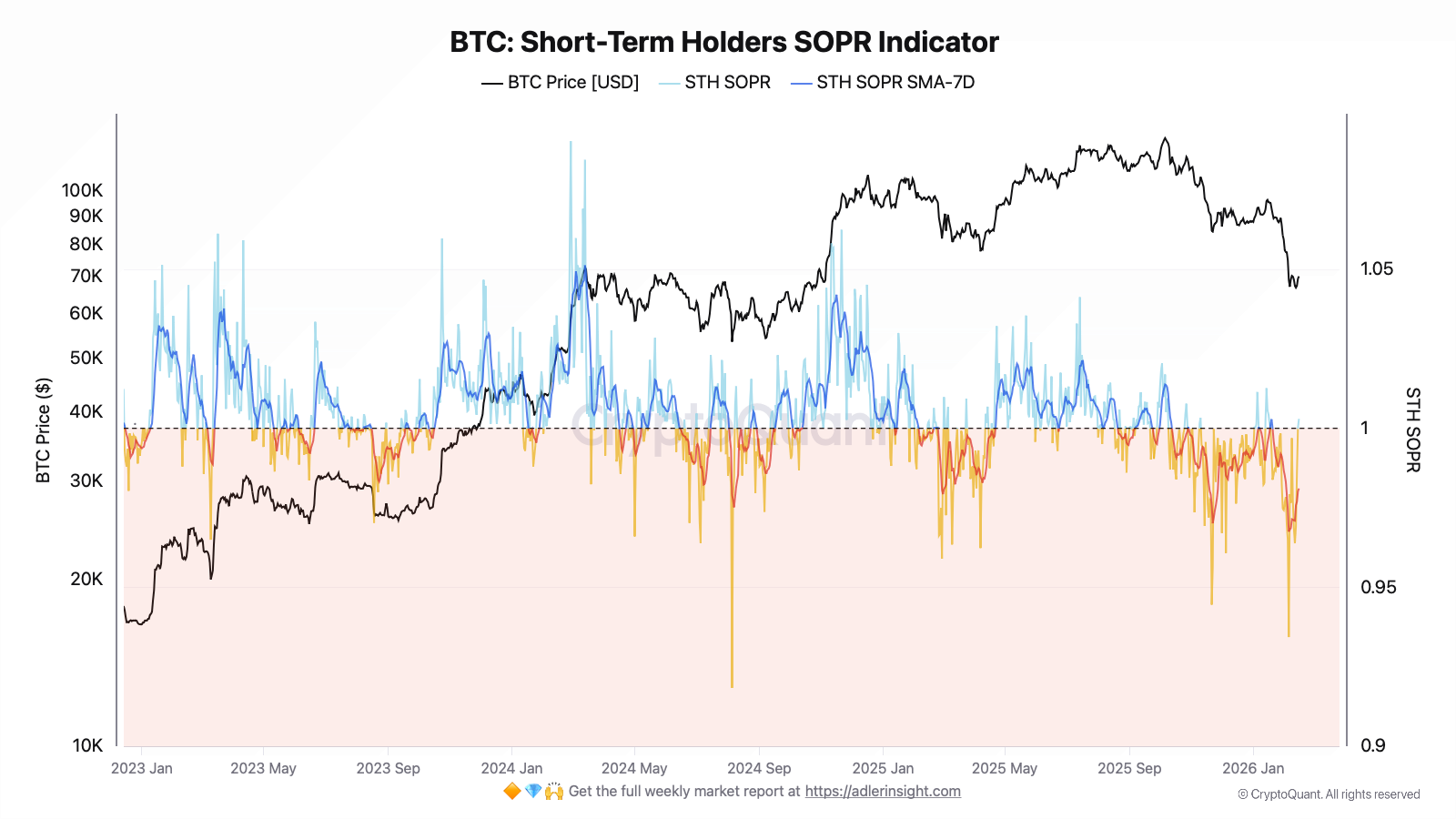 SOPR (Spent Output Profit Ratio) for short-term holders: a value below 1.0 means coins are being sold at a loss.
