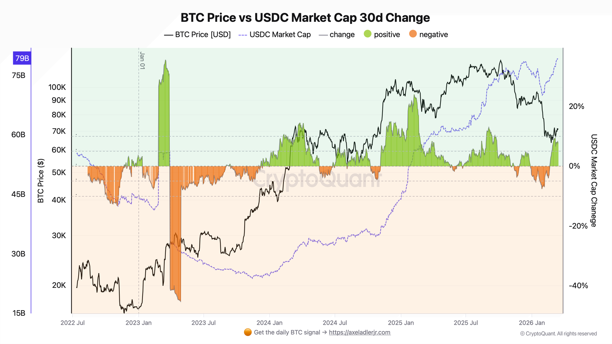 Q: What happened to USDC during the 2023 SVB crisis? A: USDC briefly depegged to $0.87 in March 2023 when Circle disclosed $3.3B in reserves held at Silicon Valley Bank. Market cap contracted sharply as holders redeemed. USDC 30d% hit extreme negative readings during this period. The recovery to peg coincided with BTC bottoming and beginning its 2023 rally - an unusual case where a stablecoin crisis cleared out weak hands and set the stage for the bull run.
