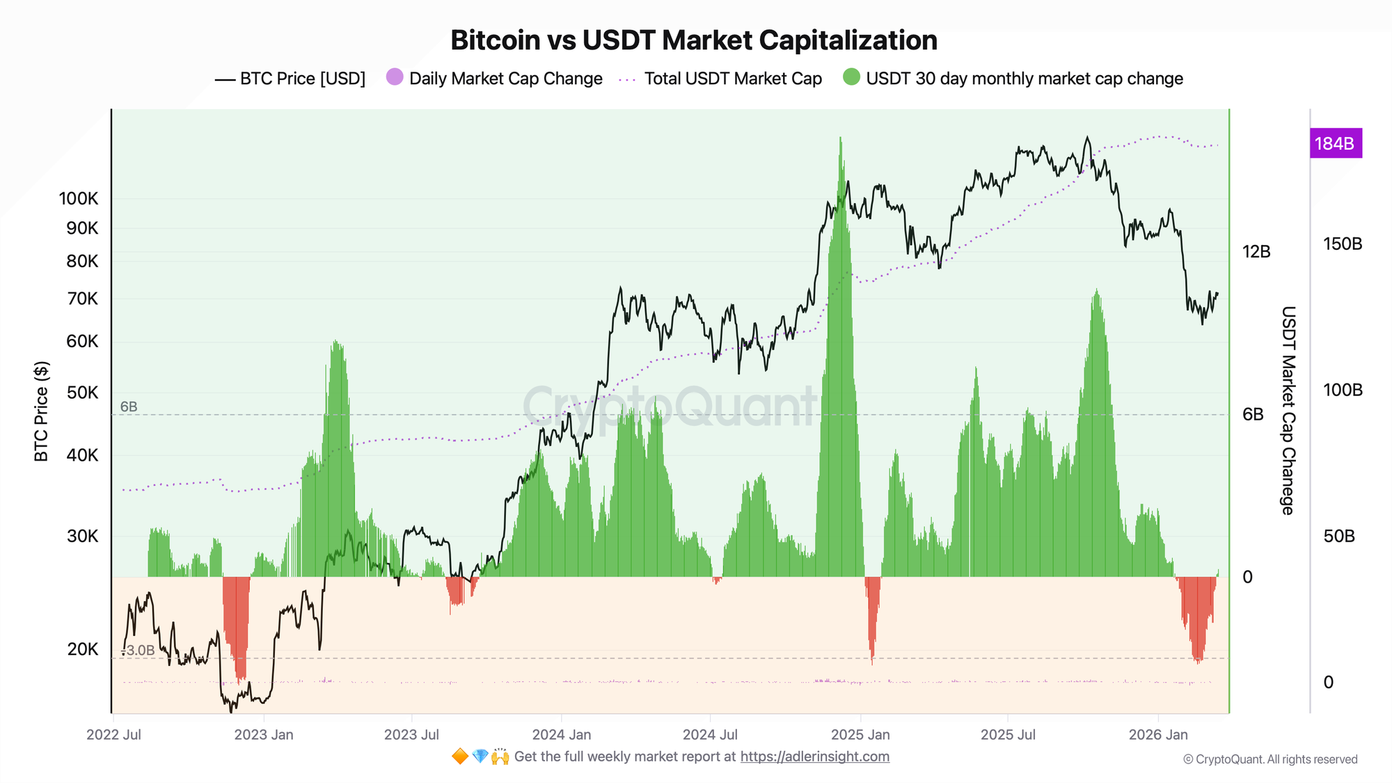 - Main practical signal: USDT 30d change flipping from negative to positive (-$315M as of March 2026) confirms a demand-side inflection point
