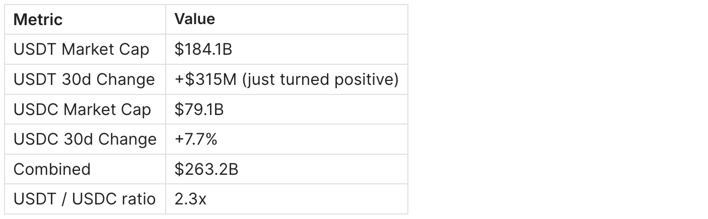 Monitor daily: USDT 30d absolute change, USDC 30d%, and the trend direction (3-day moving average of each).
