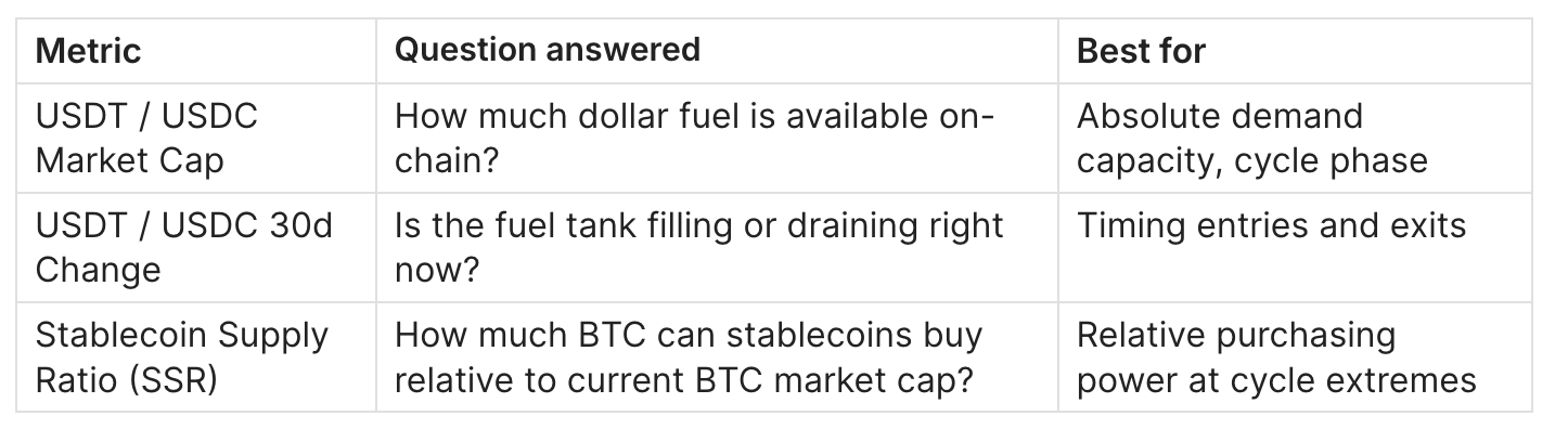 The core idea is simple: stablecoins are the fuel. Bitcoin is the engine. You watch the fuel tank.