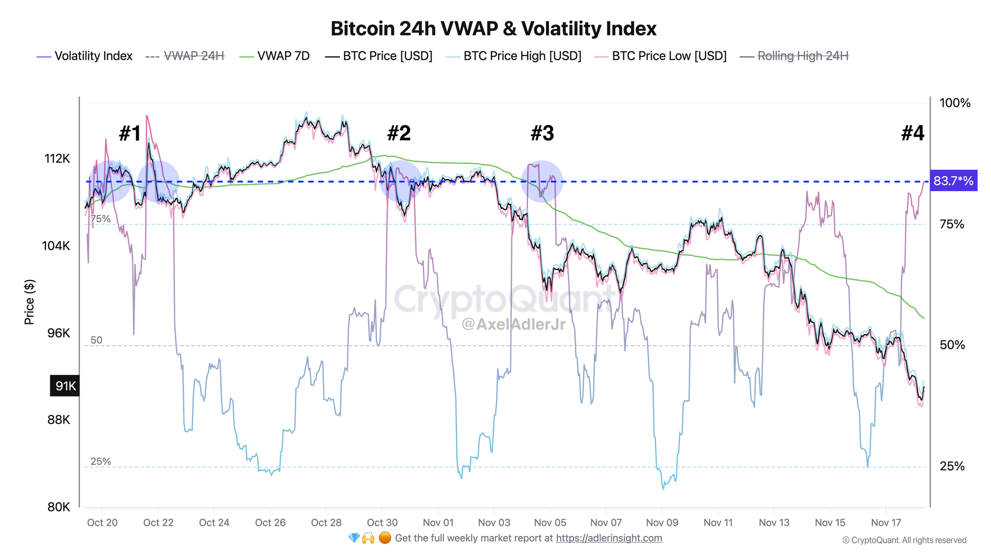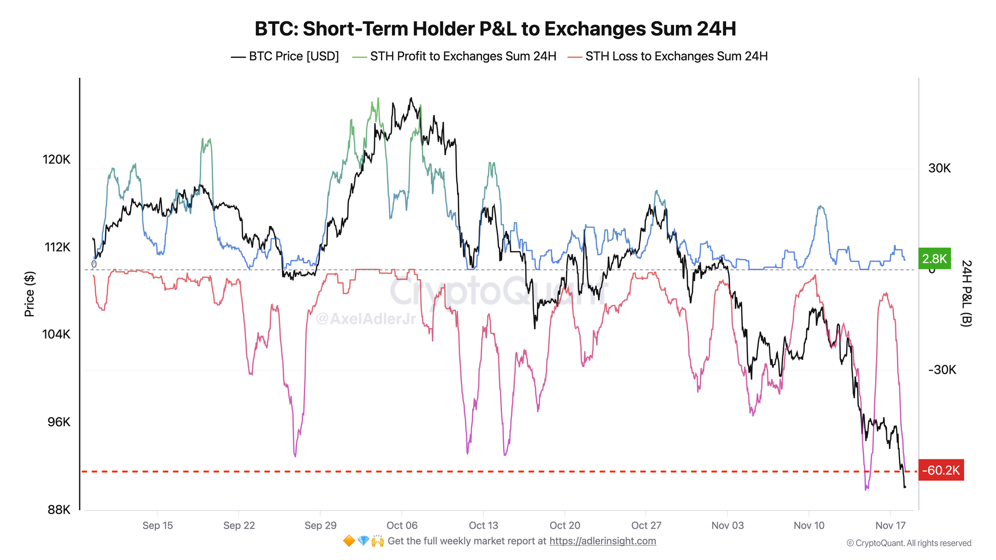 STH are realizing losses of –60.2K BTC over the past 24 hours. Price has pulled back from the $125K highs earlier this month to the current $89K. Loss-bearing coin flows to exchanges have reached an extreme level of -60.2K BTC/24h. The rise in volatility directly correlates with the scale of these losses. Price remains approximately $20K below the 24-hour VWAP, confirming that the majority of short-term buyers are underwater and actively capitulating.