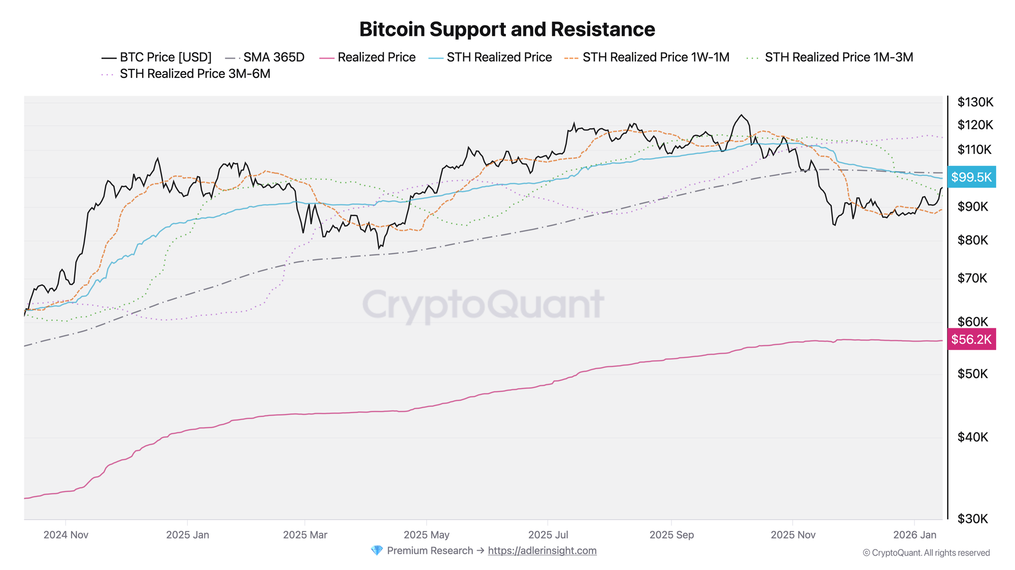 The metric displays realized prices of various short-term holder cohorts relative to BTC spot price. More on methodology and historical signals in the article Bitcoin Realized Price Bands Explained.