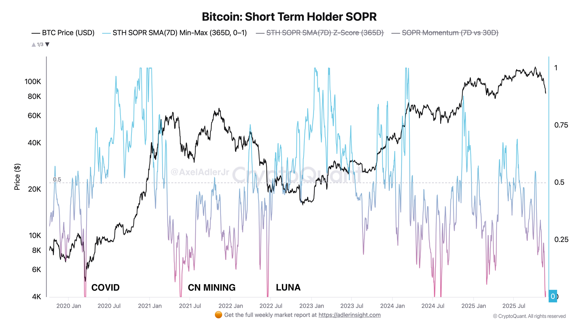 Short-term holders are realizing losses with intensity observed during COVID shock, China mining ban, and Luna collapse. SOPR Momentum dropped nearly to 0, which historically indicated capitulation zones and near-term reversal points.
