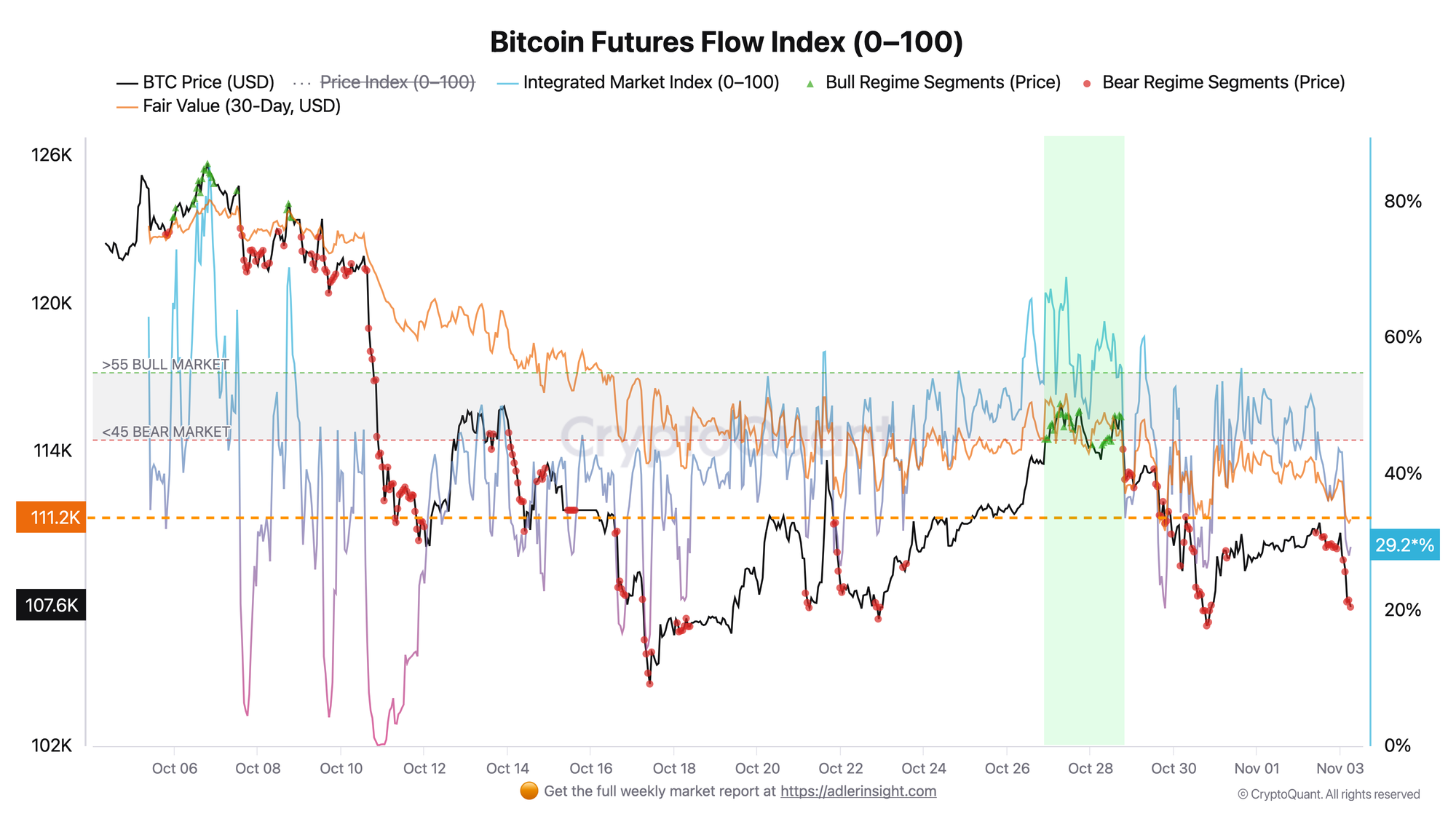 Futures flow index dropped to 29.2% - bearish zone below 45. Price $107.6K trading below 30-day fair value $111.2K. For regime change, index needs to return to neutral-bullish range and break through fair value. Moderate loss flow from STH without clear signs of capitulation combines with weak futures momentum. While index remains below 45 and price below $111.2K, priority is consolidation, decisive move will be breakout above $111.2K.