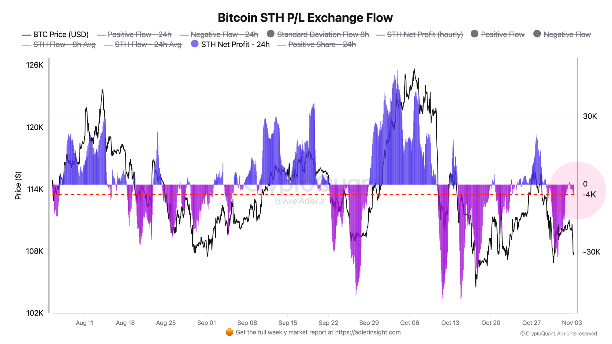 STH flows over the last 24 hours are predominantly unprofitable (around −4K BTC), indicating price pressure without panic selling. Price is oscillating around $107K. The absence of extreme loss "tails" confirms a scenario of prolonged consolidation rather than final capitulation.