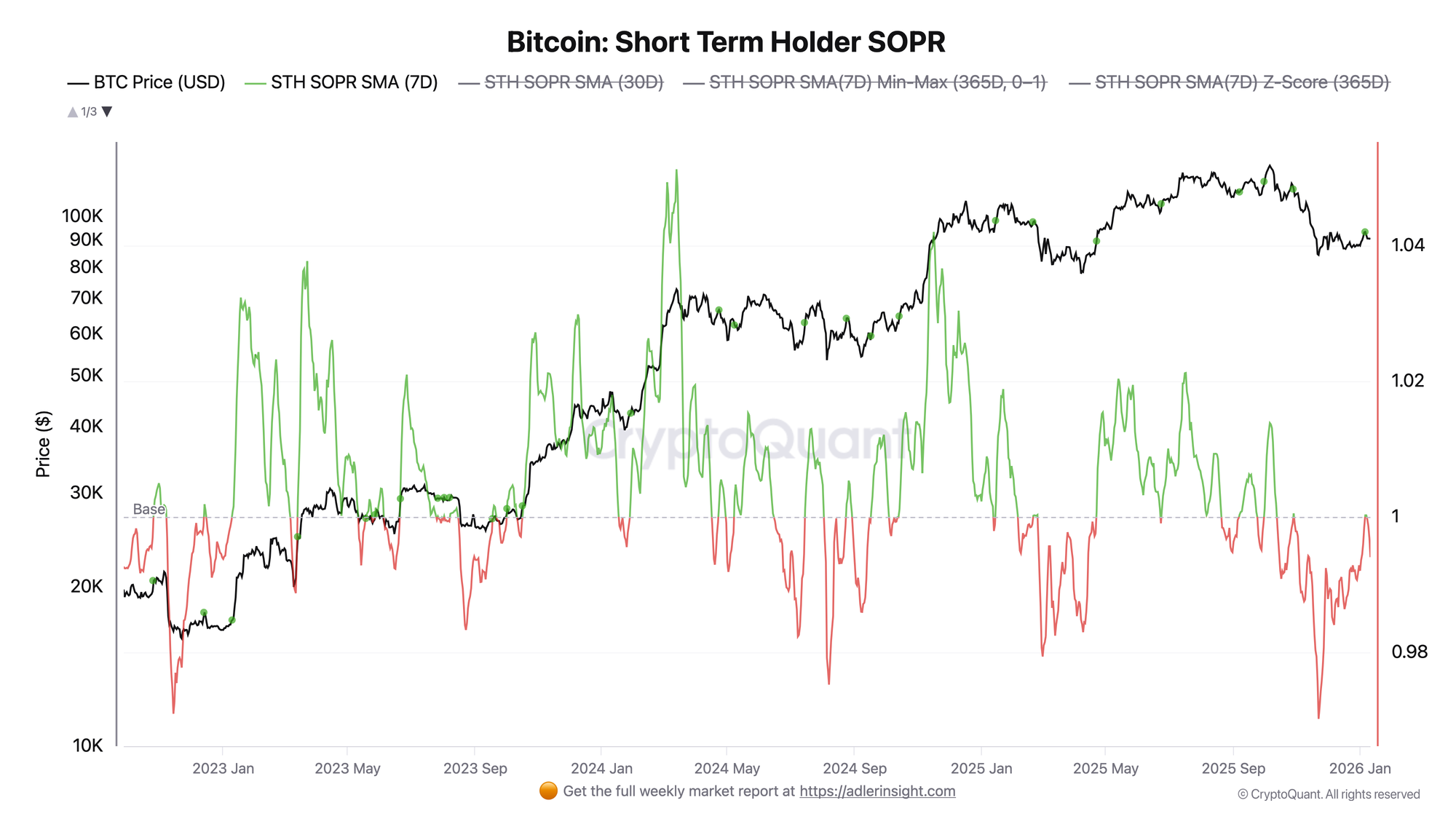 The STH SOPR metric measures the ratio of selling price to purchase price for coins moved less than 155 days ago. A value below 1.0 means that short-term holders are, on average, selling cheaper than they bought.