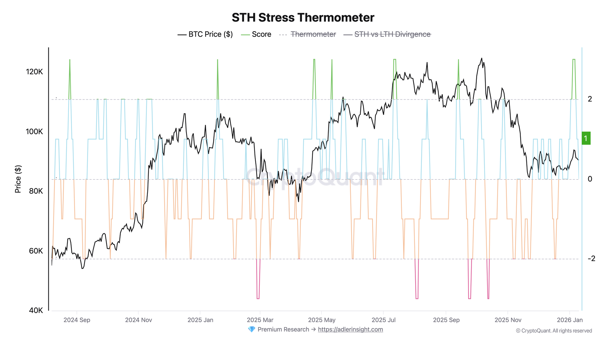 STH SOPR reflects the behavior of short-term participants who are most sensitive to volatility. When price declines, SOPR moves below 1.0 as recent buyers realize losses. A return of SOPR above 1.0 often coincides with local reversals, as forced selling pressure eases and the market transitions into a more constructive phase.