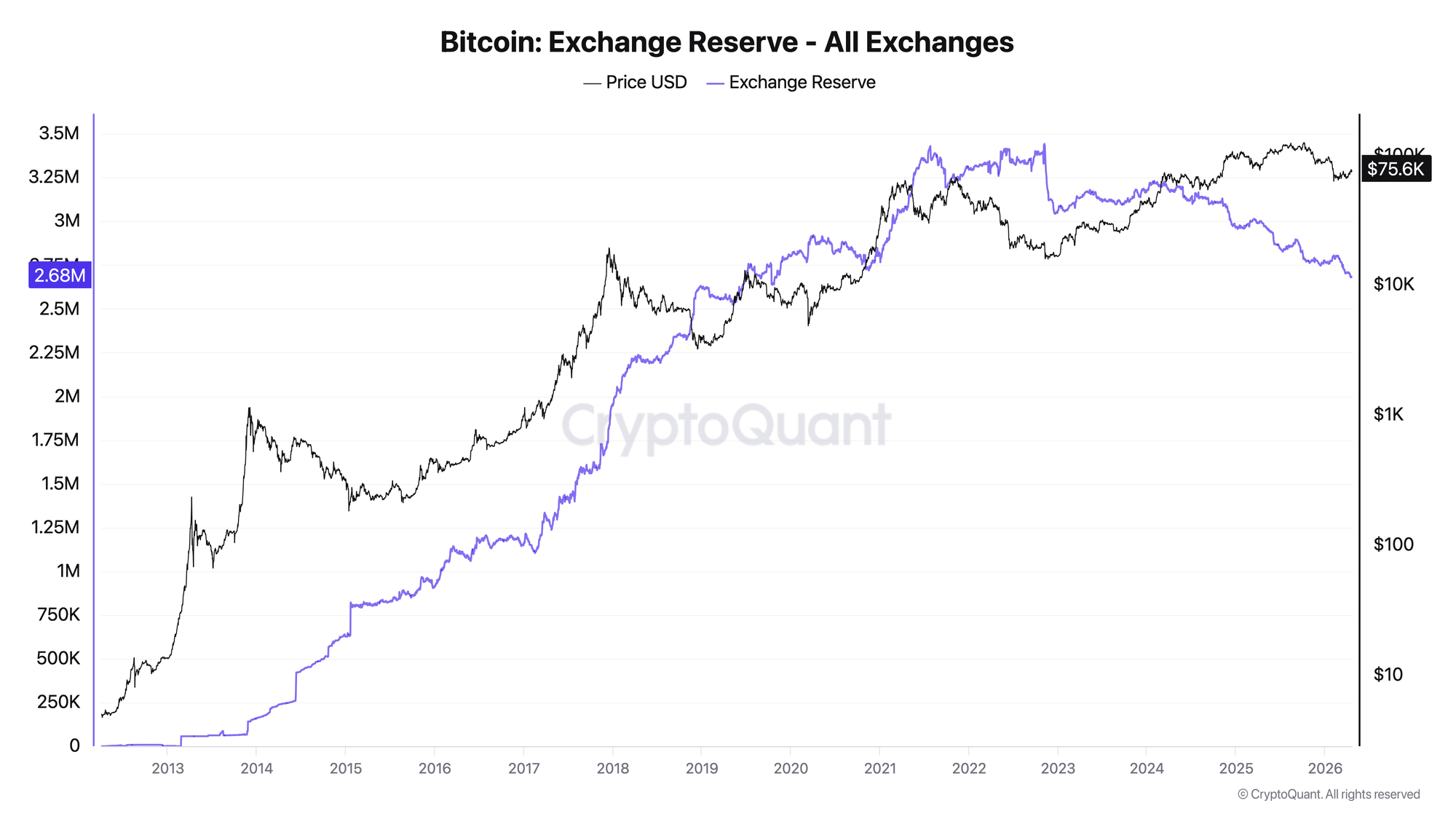 The decline in reserves combined with the absence of panic inflows during the April drawdown suggests that coins continue to settle into the hands of more patient holders. At the current price of $75K, available exchange supply is 105K BTC lower than it was in early March. The main risk to this setup is a return of coins to exchanges as price approaches higher resistance levels.