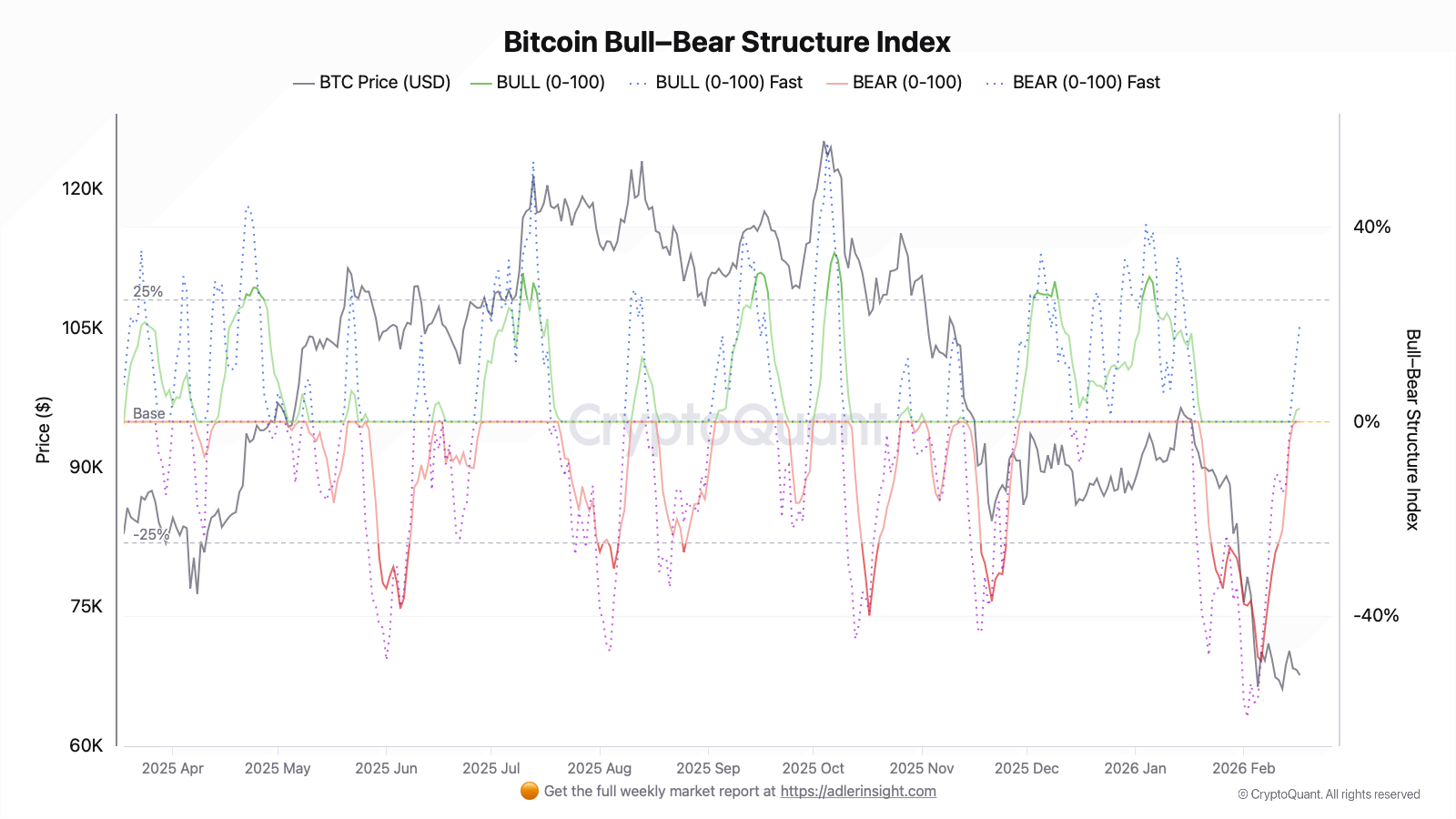 Over the last 48 hours Bitcoin declined from $69,000 to $67,170, remaining in the lower quarter of the long-term price channel. Two indicators are sending different signals: market structure remains firmly bearish, while the derivatives indicator is starting to turn up slightly.