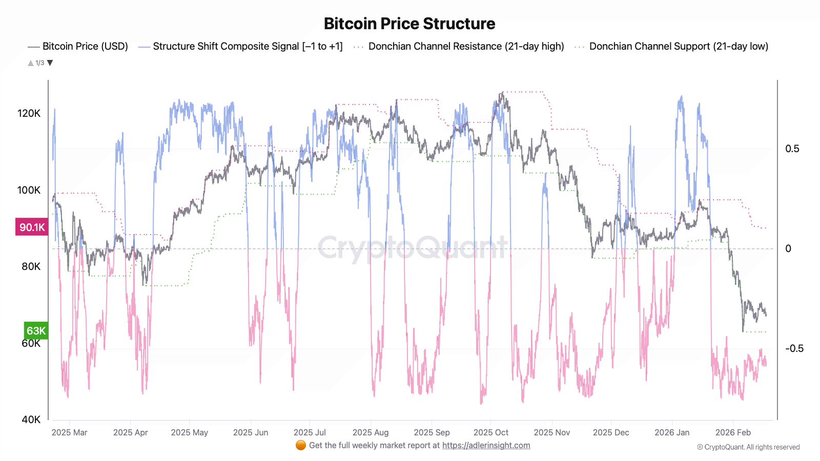 The metric reflects the position of price within the 21-day Donchian channel ($63,025-$90,147) and the composite Structure Shift - a weighted combination of channel position, EMA trend, and candle sequence.