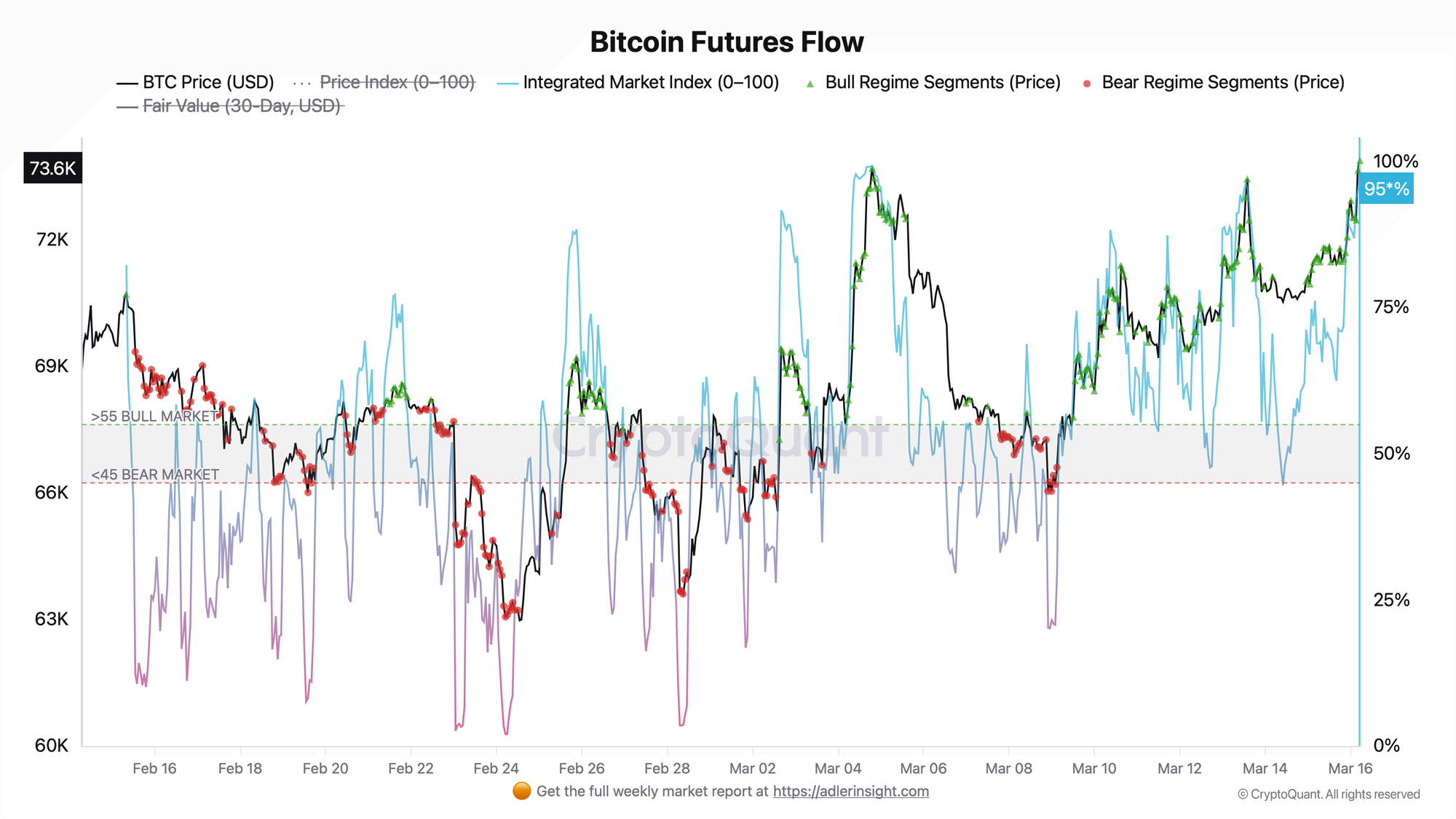 The Integrated Market Index reached 96 today - a monthly maximum. The Price Index rose to 95, with the market price of $73,886 trading at a premium of $3,453 above Fair Value of $70,433. Both model components are synchronously in Bull Regime.