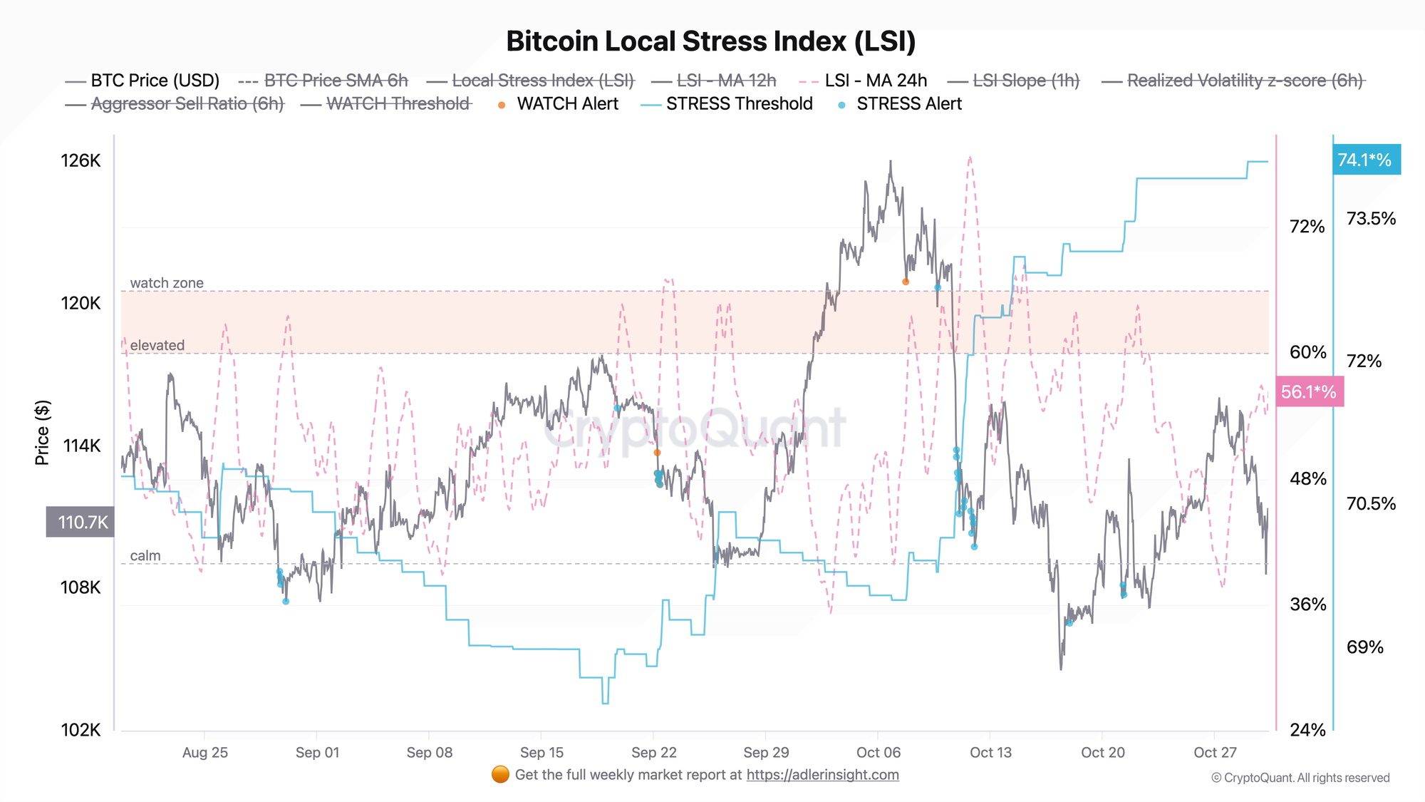 The dynamic stress signal threshold has risen to 74%, while the Local Stress Index itself remains at 56% - this is an elevated but not critical level. After the October spikes, the model automatically raised the levels at which alarm signals are generated, so now an increase in the index alone is not sufficient. For a new stress signal to appear, the model must simultaneously see price movement below the local trend, increased realized volatility, a predominance of aggressive selling, and acceleration of the index itself. These conditions are not yet present: the market looks tense, but a more pronounced deterioration in structure is required to move into the red zone.
