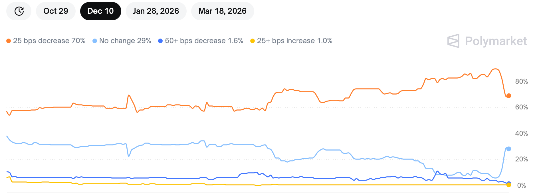 The Fed continues to ease monetary policy, cutting rates by 25 bp and ending QT from December, but Powell's cautious rhetoric regarding the regulator's further steps had a restraining effect on markets. The probability of a December cut fell from 90% to 70%, which triggered a Bitcoin pullback to local support levels.