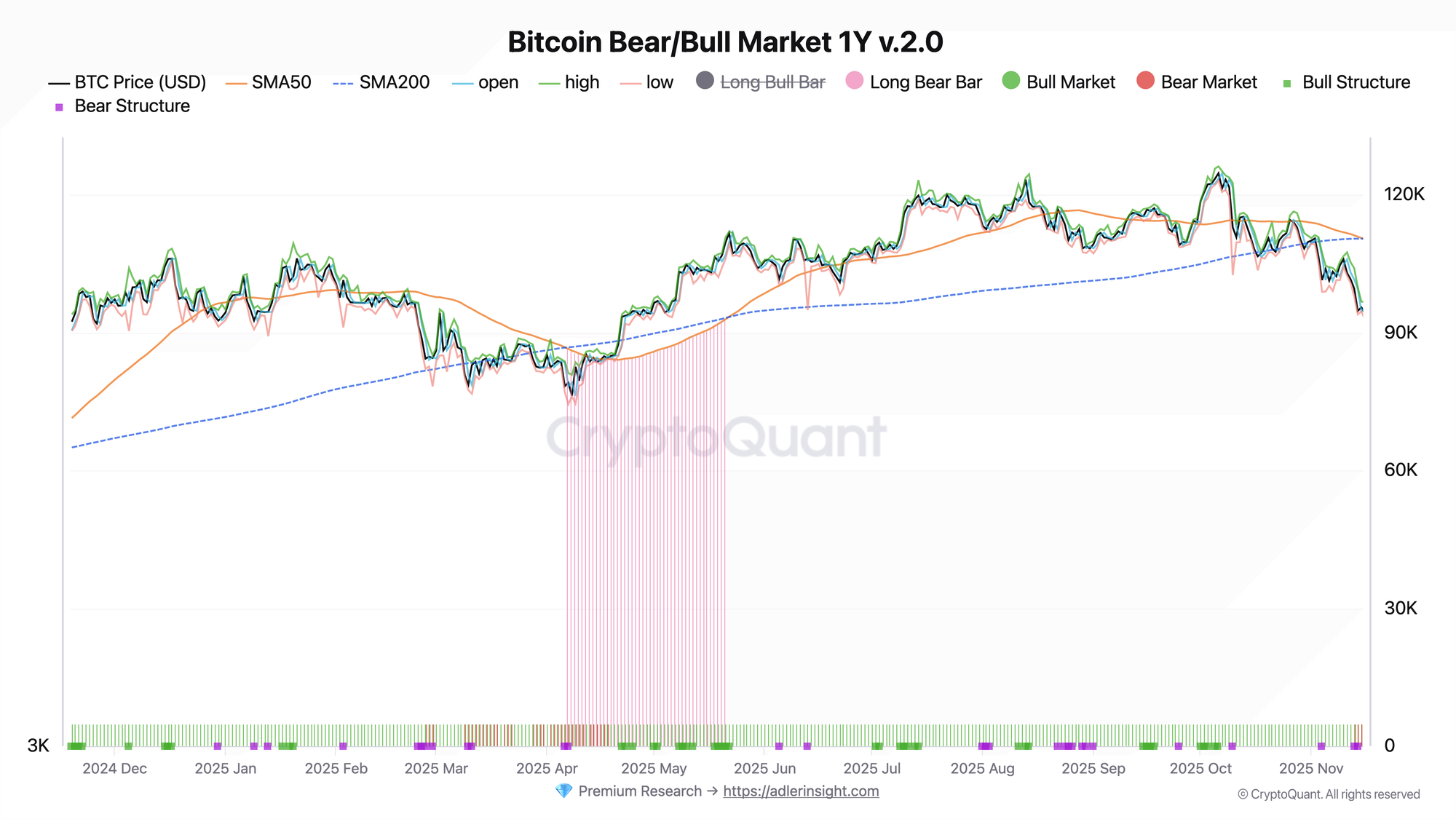 Bitcoin is trading at $97.6K, 21.8% below its October peak, two out of three metrics indicate a transition to a bearish phase, Death Cross may occur within the next 24 hours, marking the final transition to the red zone.