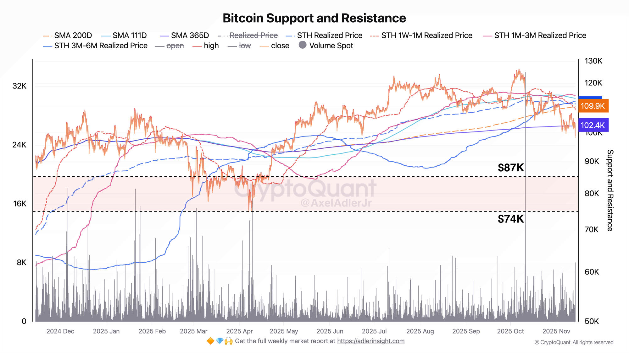 All key metrics have flipped to resistance. A complete structural inversion has occurred on the chart: what was previously support (STH metrics, annual MA) now presses from above. Below $102K there's a vacuum down to the $87K and $74K zones - these are levels where the base was formed in March-April. The Bitcoin Bear/Bull Market 1Y chart shows the reversal (two metrics bearish, third on the edge), while the Bitcoin Support and Resistance chart demonstrates the result of this reversal - complete absence of support above $102K and dense overhead resistance in the $109-115K zone.